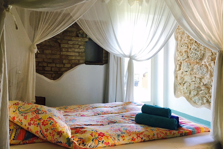 Neben einem gemütlichen Gemeinschaftsraum mit kleiner Bibliothek gibt es eine große Gemeinschaftsküche außen, im mediterranen Garten dürfen Kräuter für Tee gepflückt werden.